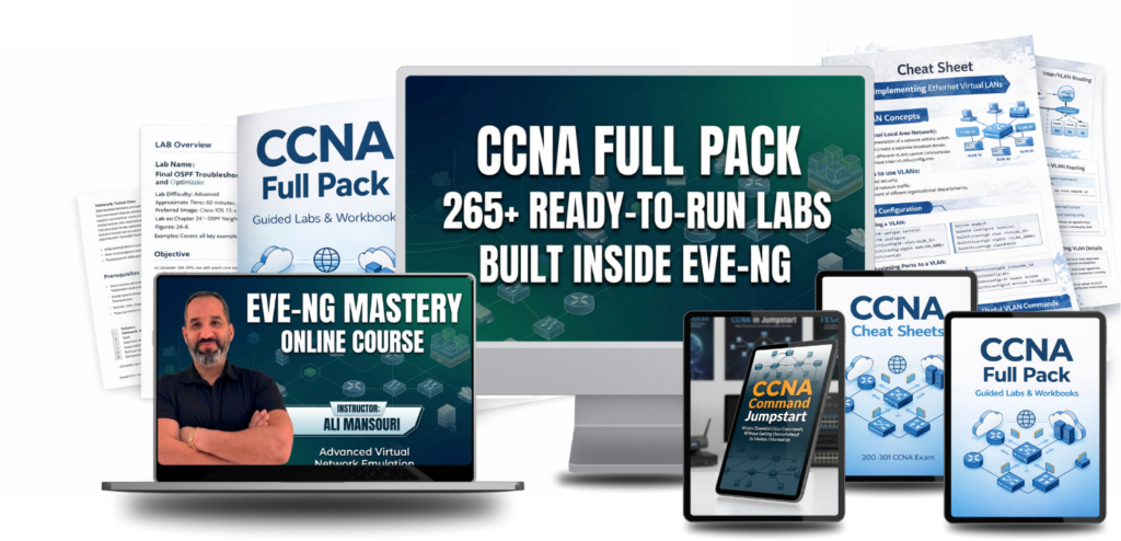 The Cisco®, EVE-NG®, and GNS3® trademarks are the intellectual property of their respective owners. The use of these names, logos, or associated trademarks on this website is solely for identification purposes and does not imply any affiliation, endorsement, or sponsorship by Cisco Systems, Inc., EVE-NG, or GNS3.