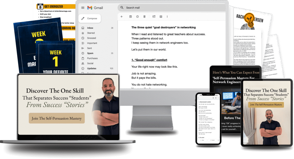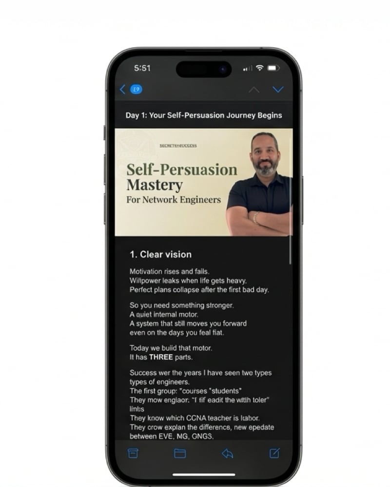 This is a deep, step-by-step email immersion experience where I’m going to teach you the exact self-persuasion framework I personally use every single day to stay consistent in labs. master technologies. lead large networks. and scale complex infrastructure projects.